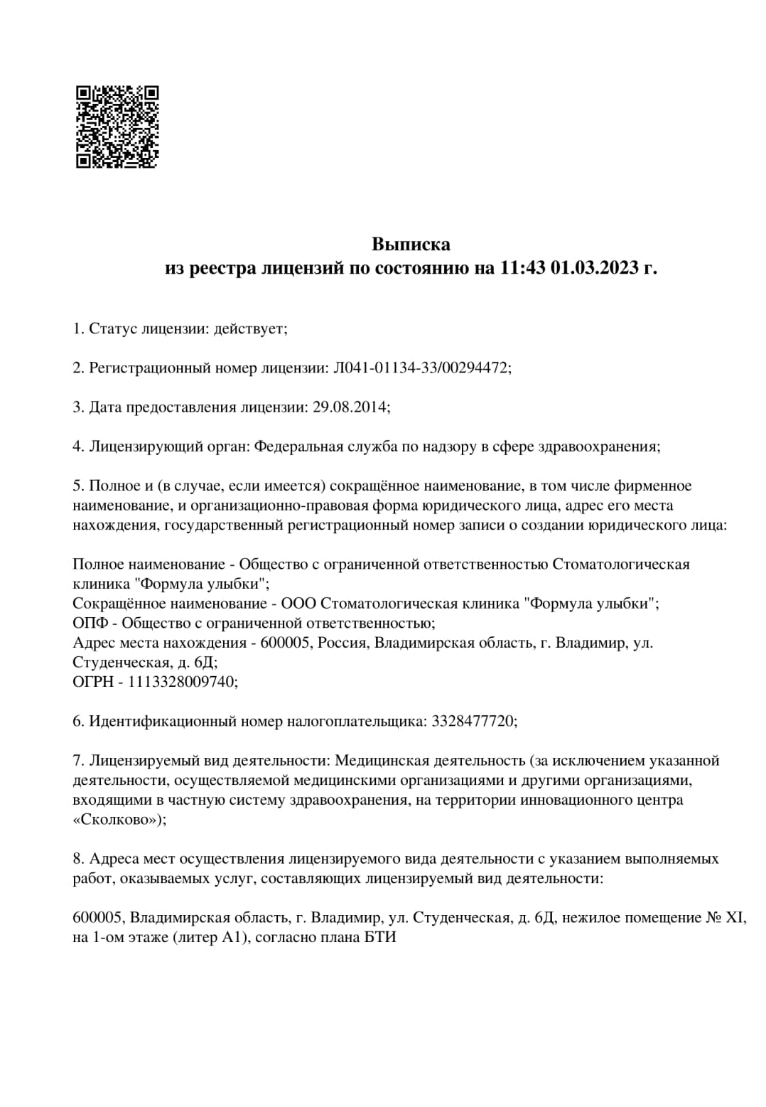 Диплом об окончании ординатуры: 107704 004893, р/номер 993 от 30.06.2022г. Квалификация – врач-стоматолог-хирург